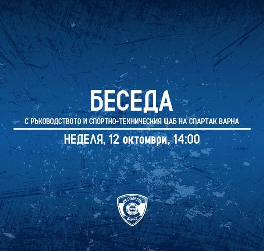 Ръководството и спортно-техническият щаб на Спартак Варна ще проведат открита беседа, която ще се състои в неделя, 12 октомври, от 14:00 часа в Конферентната зала на CAMPUS 90, на адрес: бул. „Цар Освободител“ 90, 9000 Варна.