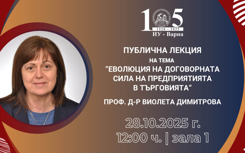 На 28 октомври (вторник) 2025 г. от 12:00 ч. в зала 1 на Икономически университет – Варна публична лекция на тема „Еволюция на договорната сила на предприятията в търговията“ ще изнесе проф. д-р Виолета Димитрова – преподавател от катедра „Икономика и управление на търговията и услугите“. Лекцията е посветена на проблемите на взаимоотношенията между производители и търговци във веригата за доставка на потребителски стоки, изследвани в едноименната монография на автора.