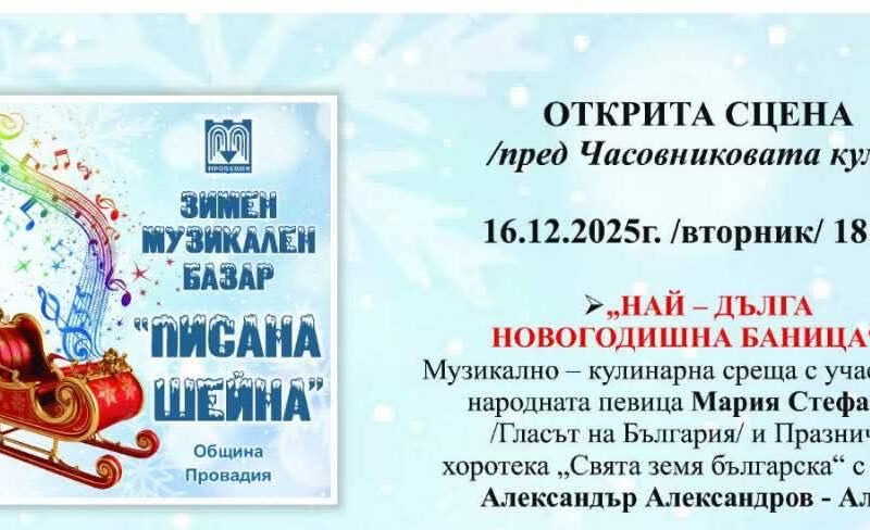 От 5 до 19 декември Провадия ще се потопи в празнична атмосфера с провеждането на зимния музикален базар „Писана шейна“. На откритата сцена пред Часовниковата кула жителите и гостите на града ще могат да се насладят на музика, танци, вкусни изненади и богата програма с участието на десетки състави и таланти от целия регион.