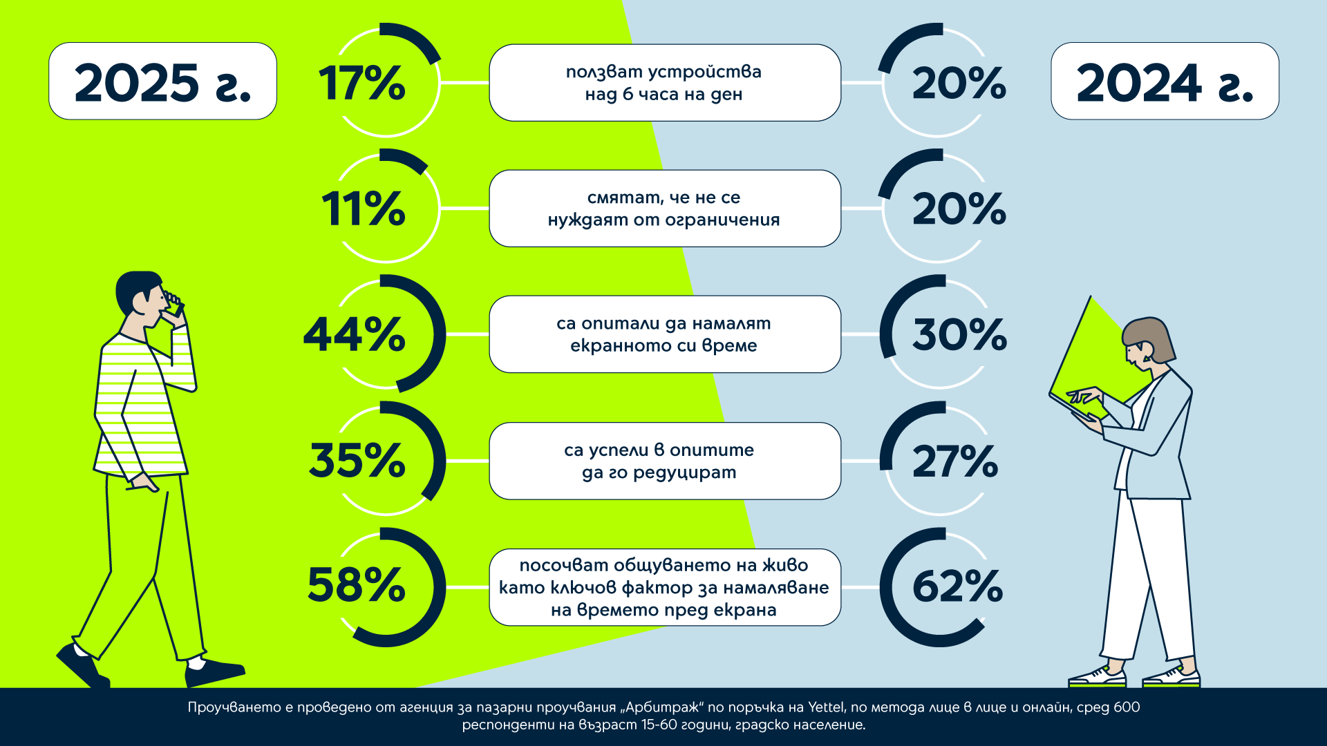 Добрата новина – и успеваемостта расте. 35% от опиталите през 2025 г. казват, че са успели да намалят екранното си време, спрямо 27% година по-рано.