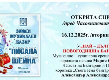 ВарнаОбласттаПровадия06.12.2025Зимен музикален базар „Писана шейна“ в Провадия обещава празнична магия От 5 до 19 декември Провадия ще се потопи в празнична атмосфера с провеждането на зимния музикален базар…отРедакция Varna News